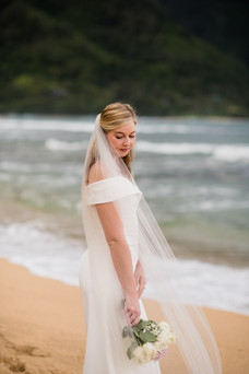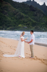 Regan and Sergiy decided to break tradition by choosing an intimate elopement instead of having a big celebration. The chose to turn their Kauai Trip into a heartfelt Elopement ceremony & a Honeymoon all in one. Their decision proved to be well worth it as their private ceremony at a remote North Shore Beach on Kauai was nothing short of magical! Although officially married after signing documents at a court house back home several days earlier, Regan and Sergiy exchanged vows & rings together on that misty morning surrounded by nothing but waves crashing against the shore & ancient volcanic mountains in the background!
